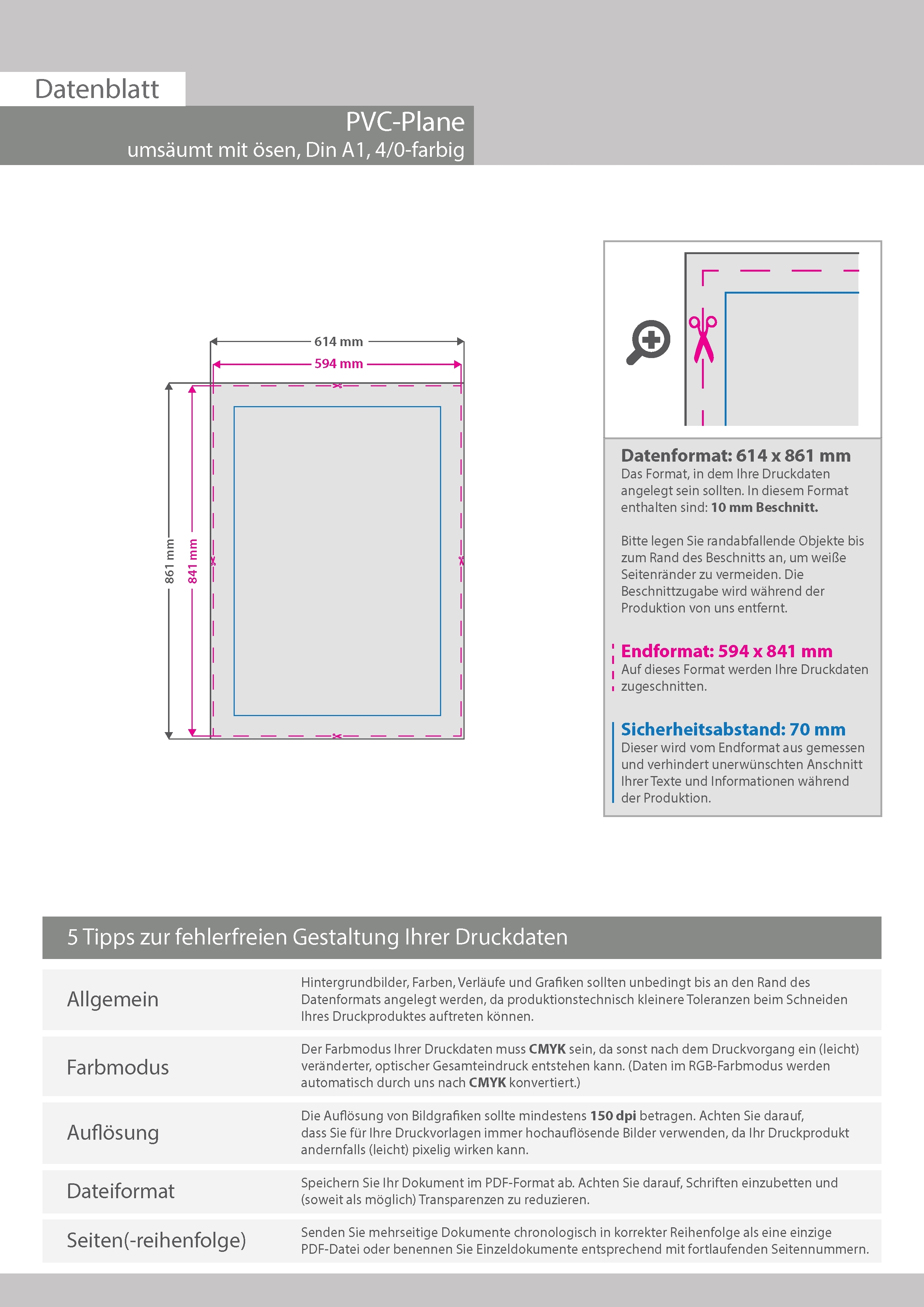Hochwertige PVC-Plane DIN A1 (59,4 x 84,1 cm), 4/0-farbig bedruckt, Umsäumt + Ösen im Abstand von 50 cm links und rechts